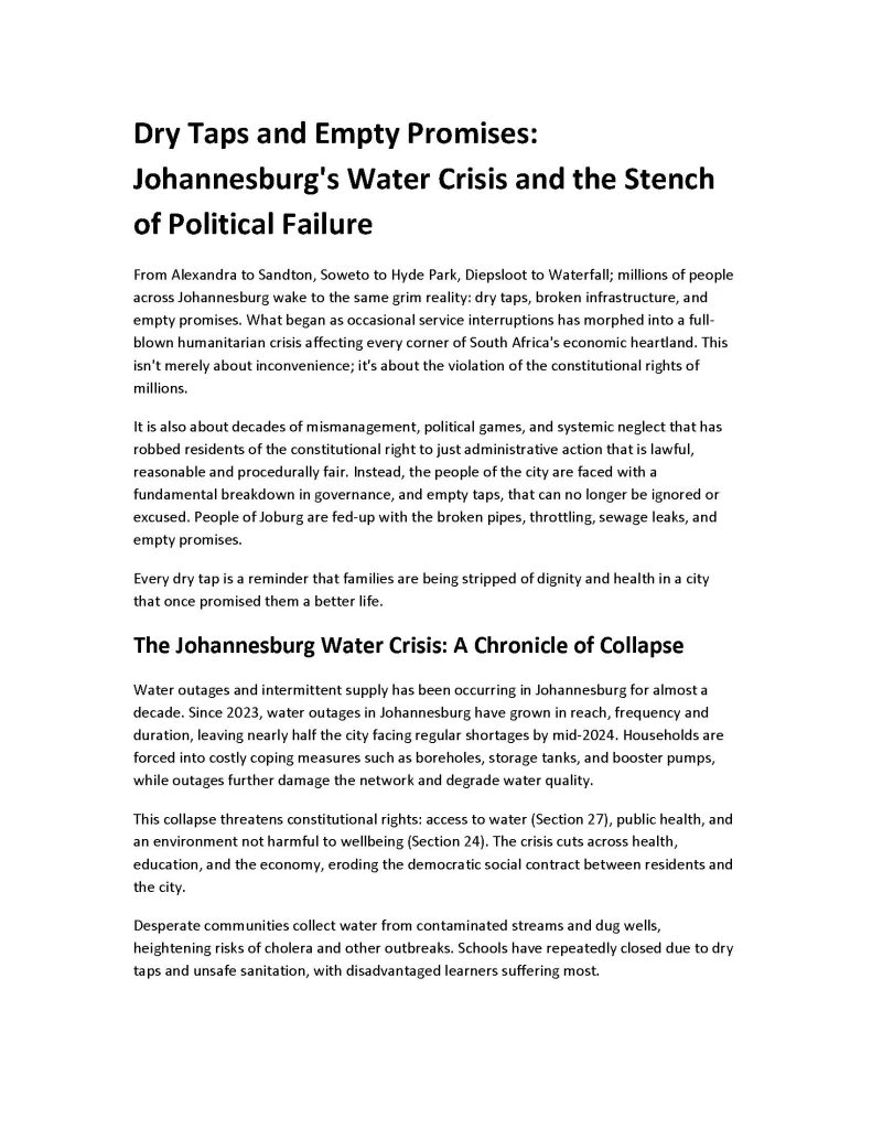 It is also about decades of mismanagement, political games, and systemic neglect that has robbed residents of the constitutional right to just administrative action that is lawful, reasonable and procedurally fair. Instead, the people of the city are faced with a fundamental breakdown in governance, and empty taps, that can no longer be ignored or excused. People of Joburg are fed-up with the broken pipes, throttling, sewage leaks, and empty promises.